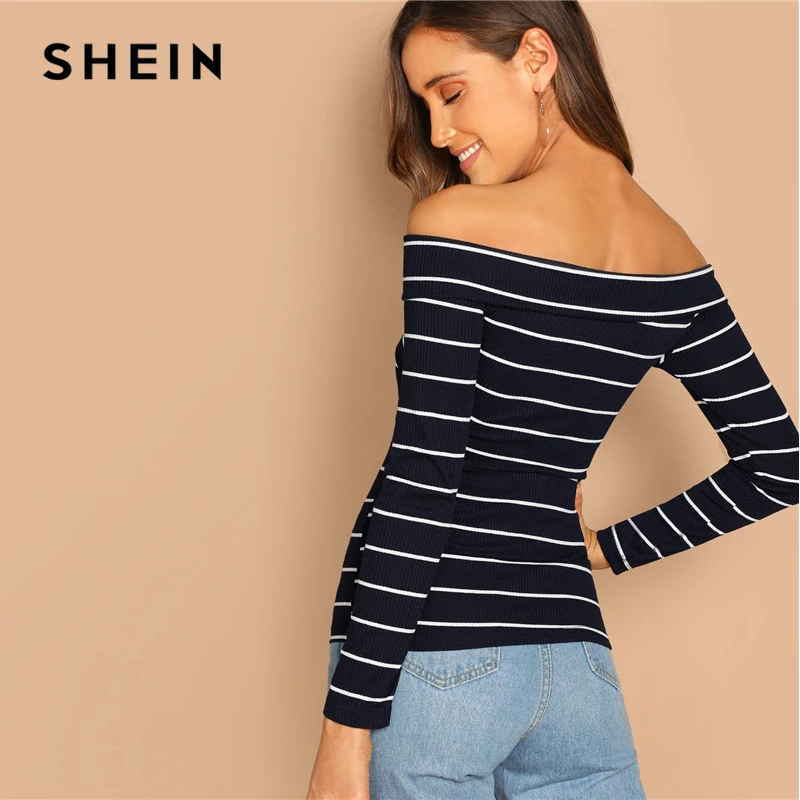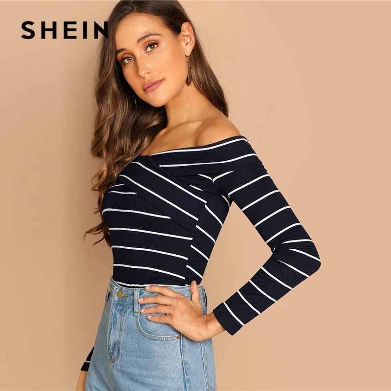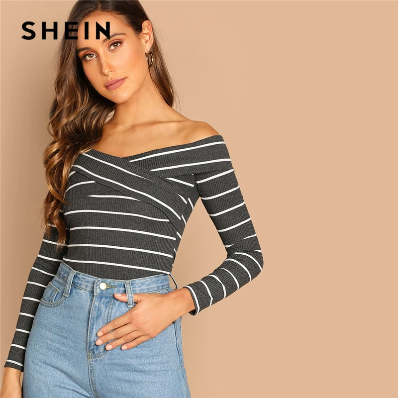 . (40% Rabatt) Kaufen Günstig SHEIN Ausgehen Highstreet Elegante Quer Wrap Weg Von der Schulter Gestreiften Pullover T Herbst Frauen Casual Frauen T shirt Top Preise Online.