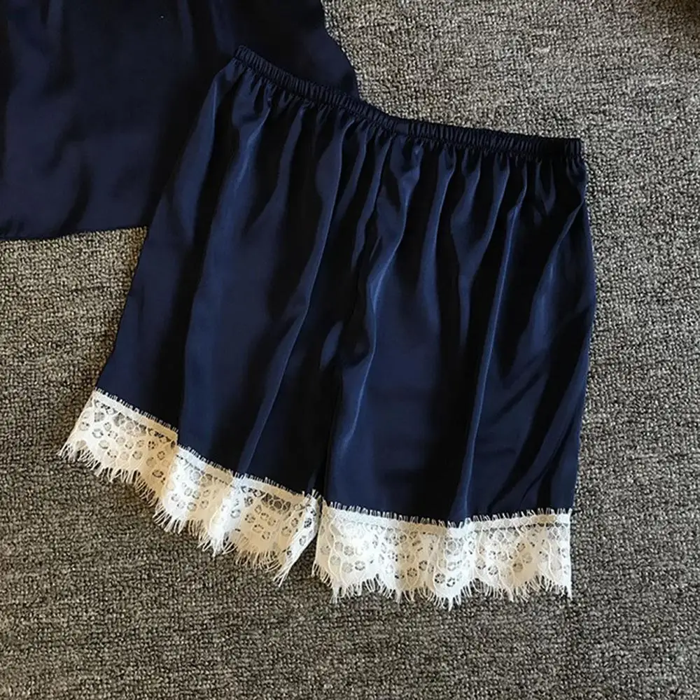 Special Offer Frauen Nachtwäsche Sexy Satin Pyjama Set Schwarz Spitze V ausschnitt Pyjamas Sleeveless Nette Cami Top und Shorts pijama mujer algodon veran Discount 38% Today!