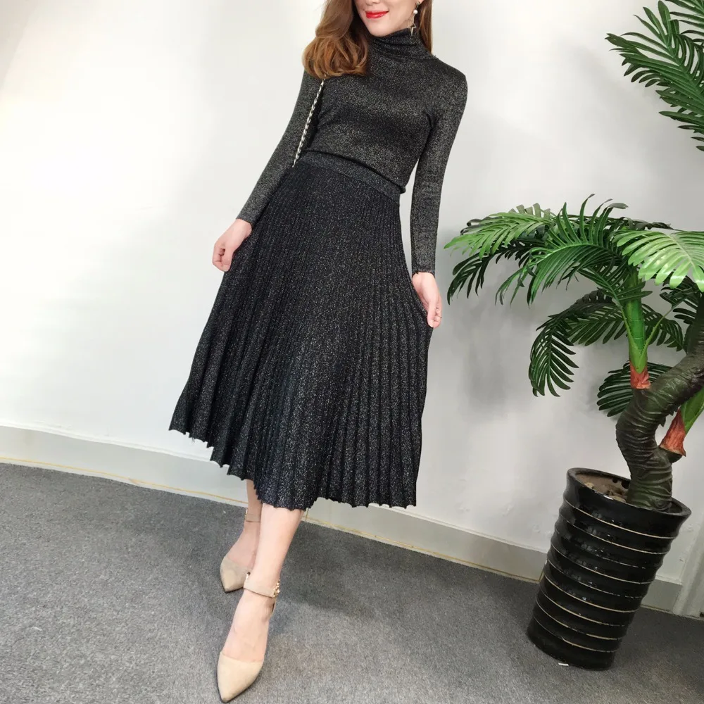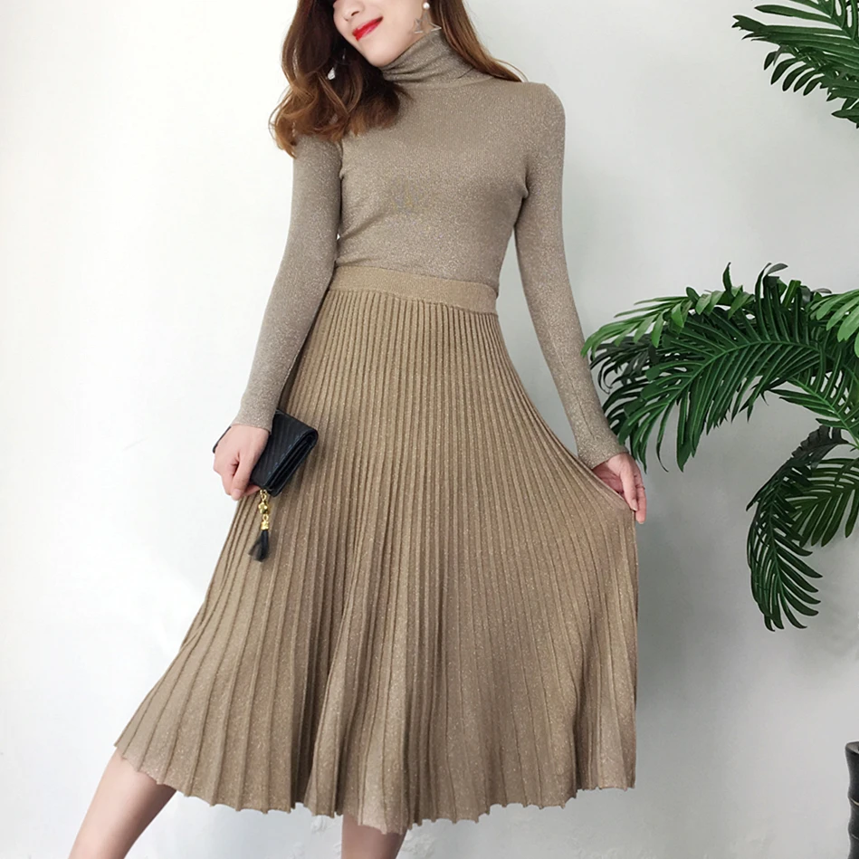 Special Offer Frauen herbst und winter retro helle seide rollkragen pullover anzug pullover pullover + lange plissee rock damen anzug 2019New Discount 35% Today!