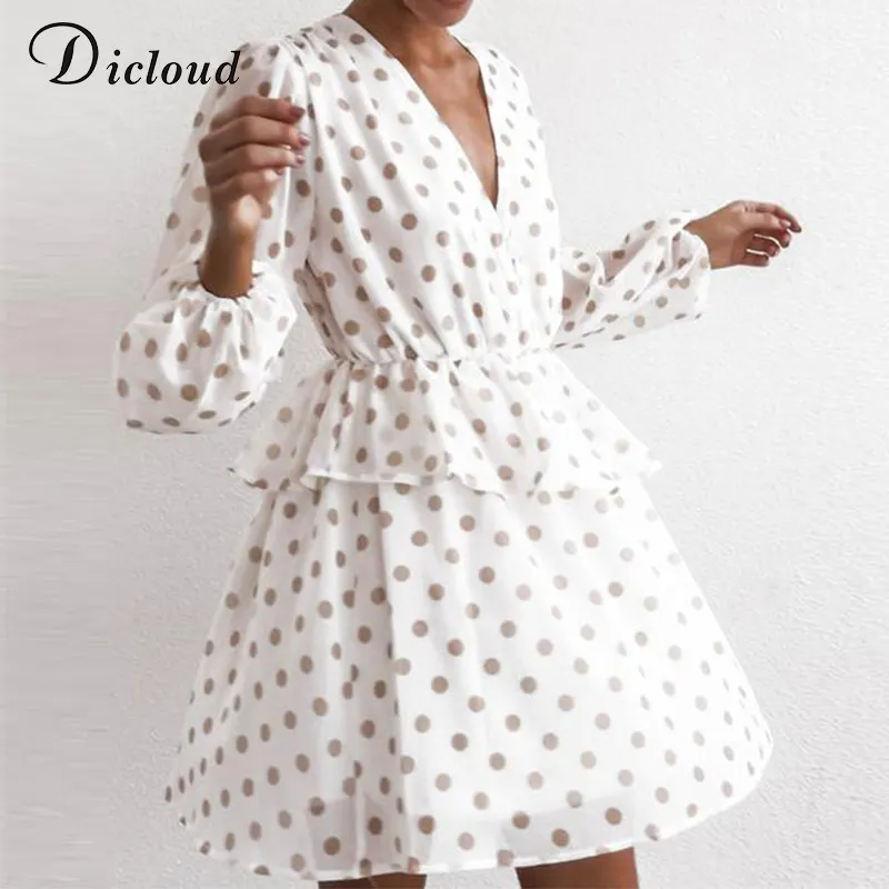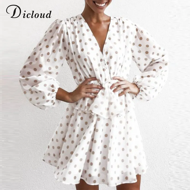 Special Offer DICLOUD Elegante Polka Dot Sehen Durch Chiffon Vintage Kleider Frauen Sommer Herbst Langarm Beige Strand Party Sommerkleid Discount 42% Today!
